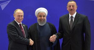 本周三,俄罗斯总统弗拉基米尔·普京访问德黑兰期间与伊朗最高领袖阿亚图拉·阿里·哈梅内伊、伊朗总统哈桑·鲁哈尼、阿塞拜疆总统伊利哈姆·阿利耶夫会晤。