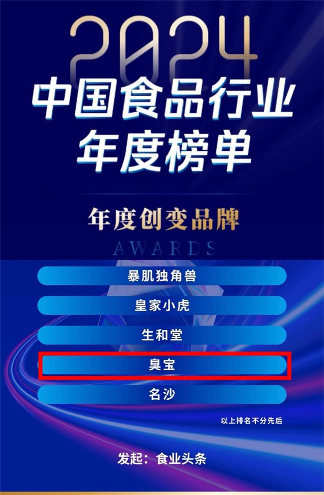 近日,食业头条正式揭晓“2024中国食品行业年度榜单”,臭宝凭借其产品创新上的突破与亮眼的市场表现,荣获“年度创变品牌”。此次入选,是对臭宝过去成绩的肯定,更是对其在行业变革中所展现出的创新精神的认可。