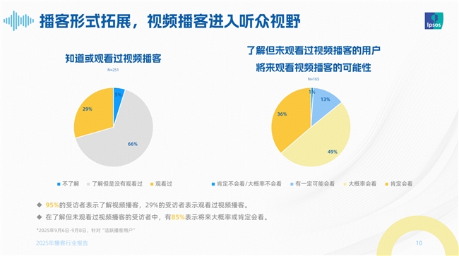 《报告》显示,高达95%的受访者知晓视频播客,在了解但未观看过视频播客的受访者中,85%表示出强烈的观看意愿。人们更喜欢视频播客的主要原因在于信息传递更丰富、视觉记忆更深刻、更能直观观察嘉宾的情绪变化。