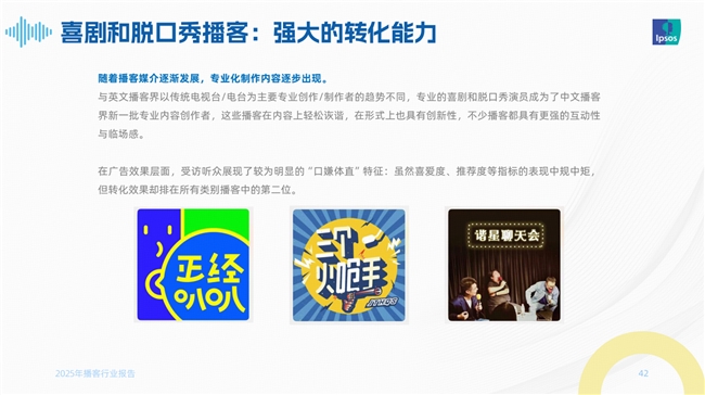 此外,播客广告还具备“品效合一”的传播效能:好感度与推荐度更高的品牌,其考虑度和购买度也更高。在转化度方面,喜剧和脱口秀播客展现出强大的转化能力。这一中文播客市场的新兴种类,具有强互动性与临场感的特点。《报告》显示,虽然听众对其的喜爱度、推荐度等指标的表现都中规中矩,但其转化效果却排在所有类别播客中的第2位。