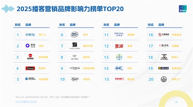 本次《报告》还评选出了“2025播客营销品牌影响力榜单Top20”,以高频消费类品牌(如外卖、饮品等)、保健品牌、科技互联网品牌为主。其中,饿了么、夸克、雅诗兰黛、巴黎欧莱雅、华夏基金、美团医美都同喜马拉雅保持着合作关系。