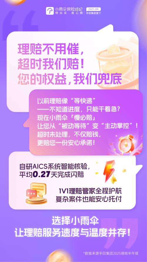 10月30日,手回集团旗下小雨伞保险经纪与手回保险代理(原“创信保险销售”更名中)正式推出理赔服务“慢必赔”,这是继“闪赔”“1V1理赔管家”之后,集团在理赔服务领域的又一次重大升级。从“闪赔”到“慢必赔”,手回集团正通过科技赋能与服务创新,构建“用户可感知、行业可对标”的服务体系,推动旗下子公司从“保险销售平台”向“保险服务生态”转型。
