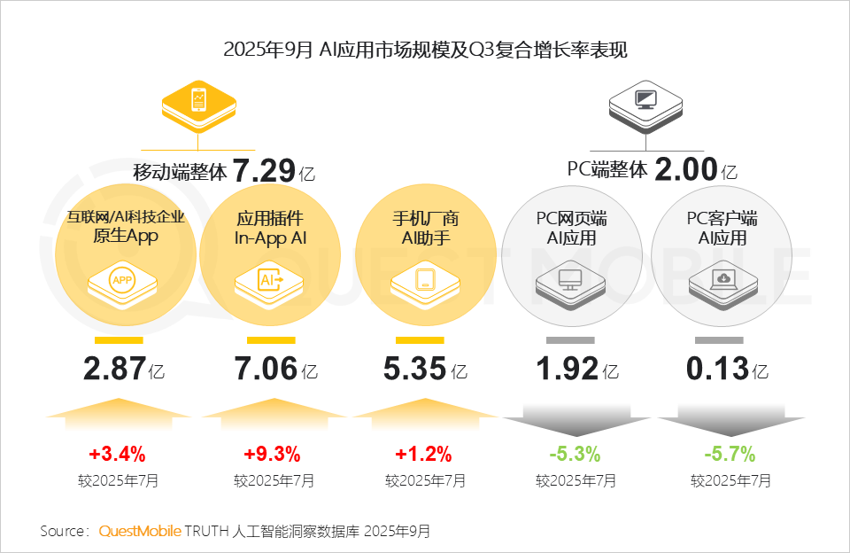 10月28日,国内知名的商业智能数据服务商QuestMobile发布了2025年第三季度中国AI应用市场报告。数据显示,截止2025年9月,AI应用市场上移动端和PC端月活跃用户量分别达到7.29亿、2.00亿,其中,移动端原生APP、In-APP AI及手机厂商AI助手整体规模分别为2.87亿、7.06亿、5.35亿,较三季度初的7月份分别增长了3.4%、9.3%、1.2%。