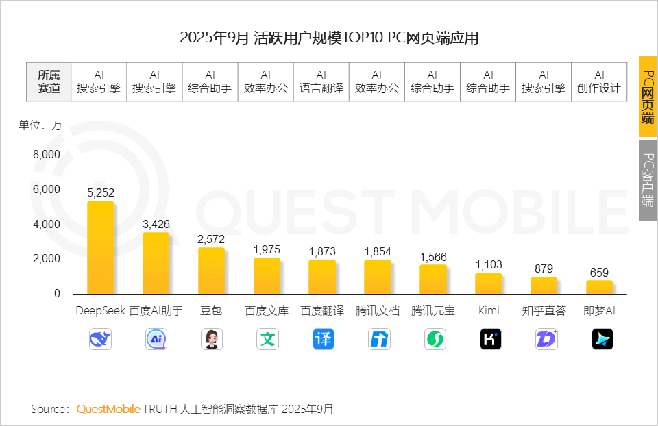 这当中,头部阵营的整体格局相对稳定,不过竞争相当激烈。豆包APP 在这个季度也实现了对DeepSeek APP的反超,二者月活跃用户规模分别为1.72亿、1.45亿;而在PC网页端,DeepSeek仍居于第一的位置,月活跃用户规模为5252万,紧随其后的百度AI助手、豆包分别为3426万、2572万。