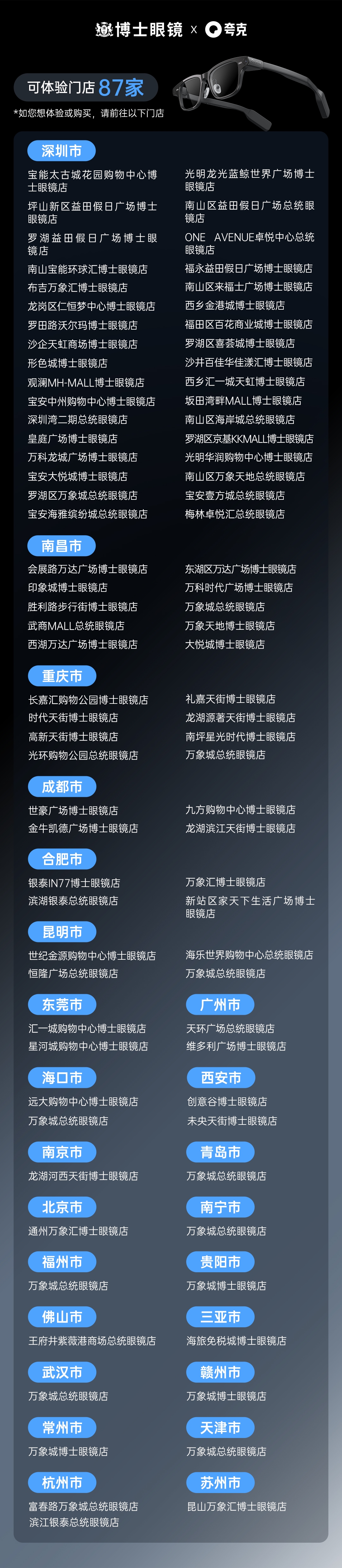 即日起,前往以下博士眼镜门店(详见下图)即可体验和购买夸克AI眼镜S1,并且在门店购买夸克AI眼镜S1的用户可享受专业的验光与配镜服务。博士眼镜将依托其严谨的验配流程与服务经验,确保每一位用户都能获得清晰、舒适且与智能眼镜形态完美契合视觉解决方案。