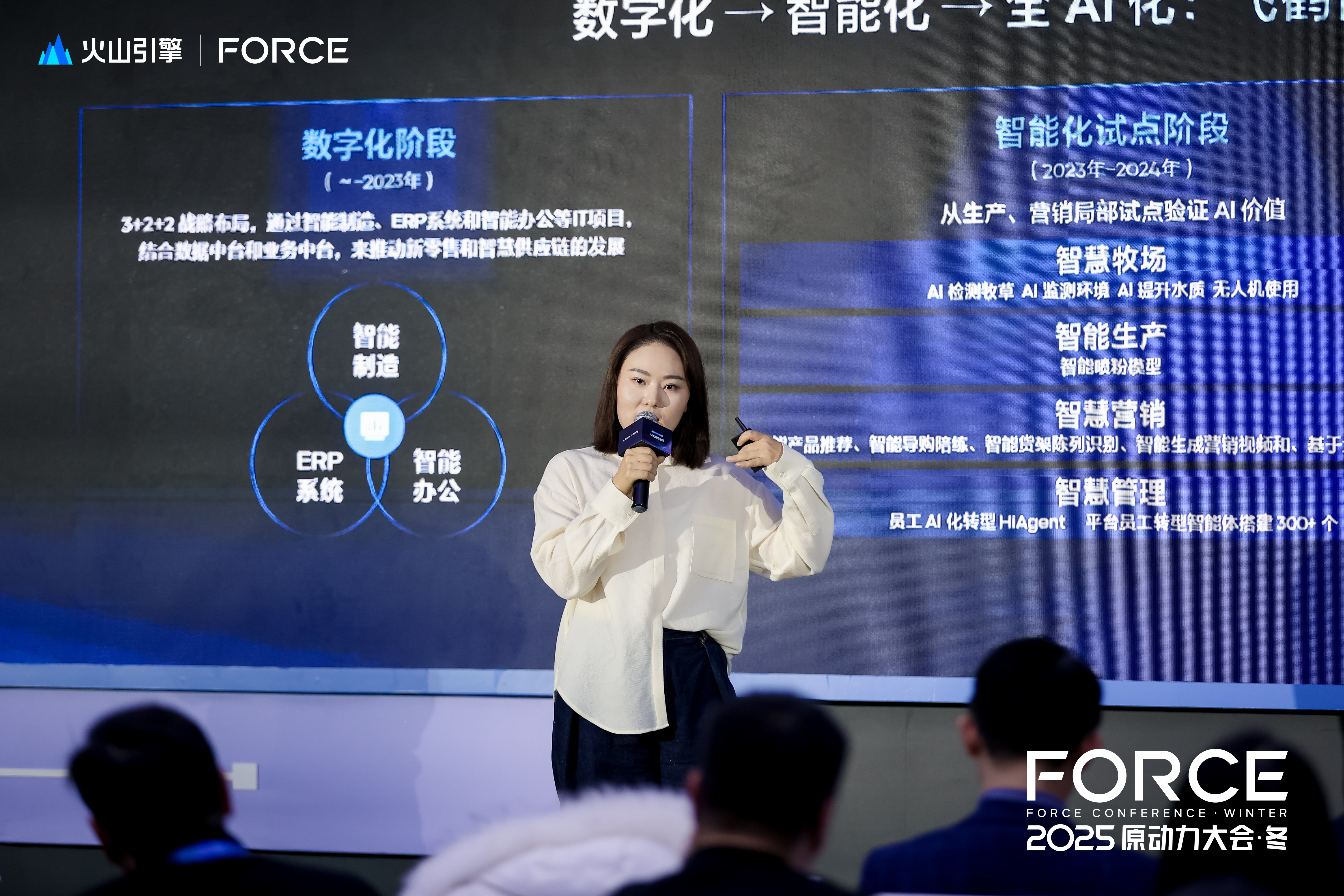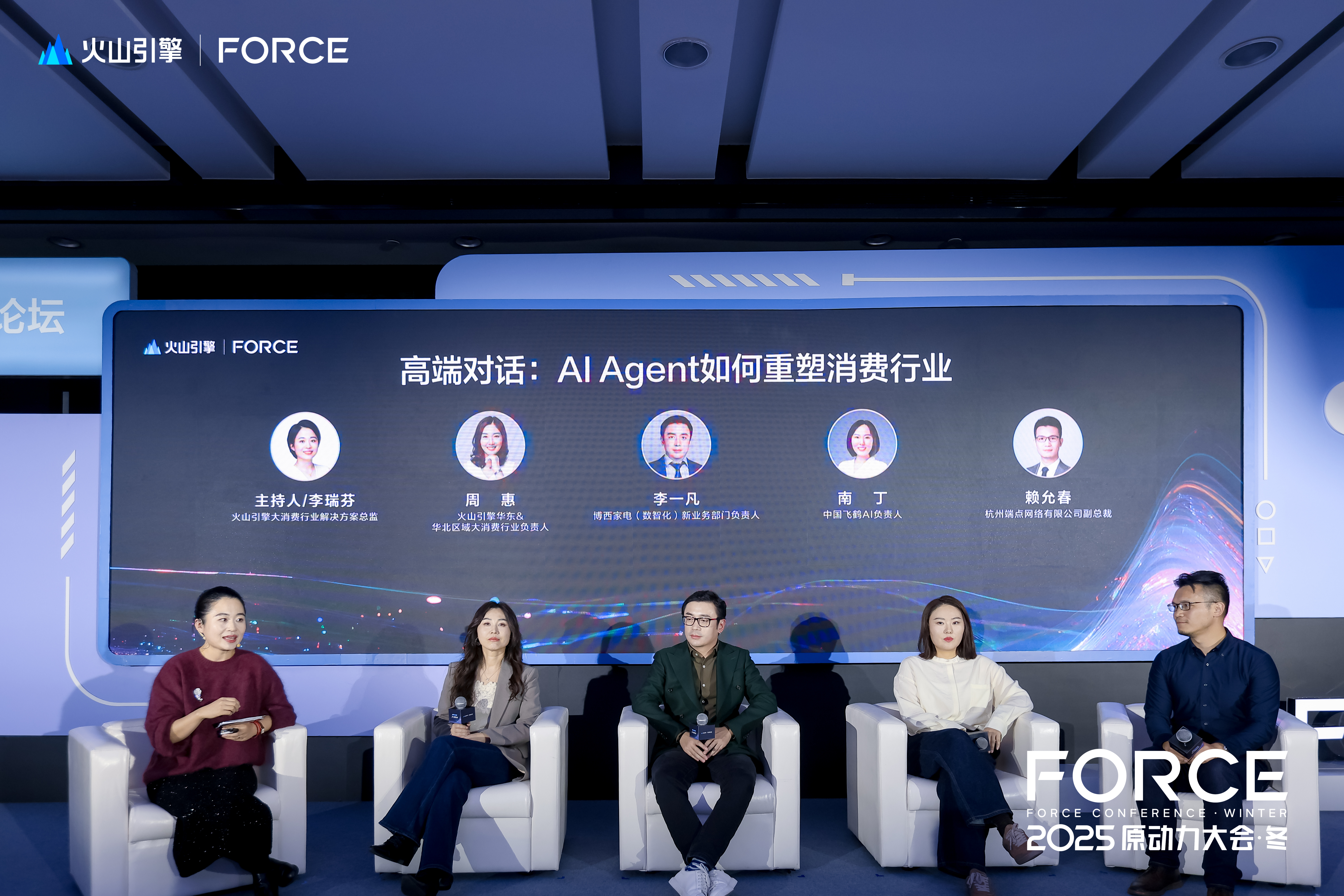 在2025冬季FORCE原动力大会“AI+消费”论坛上,火山引擎发布了AI 消费云解决方案,助力数据洞察、创意营销、智能导购、智能客服、智能巡检等消费行业全场景提质增效。论坛还邀请到来自立邦集团、美的集团、中国飞鹤、博西家电、端点科技等嘉宾,分享了消费行业应用AI 的前沿实践。