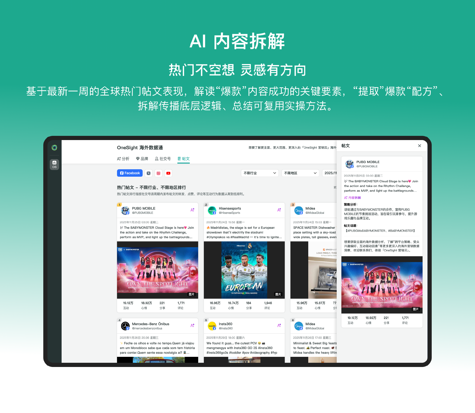 从全球热门帖文中提炼爆款内容的底层逻辑、创作方法与核心话题标签,输出可直接执行的内容灵感与方向,让内容创作不再依赖经验试错,而是建立在数据反馈与市场需求之上,助力企业打造贴合本地化审美的优质内容。