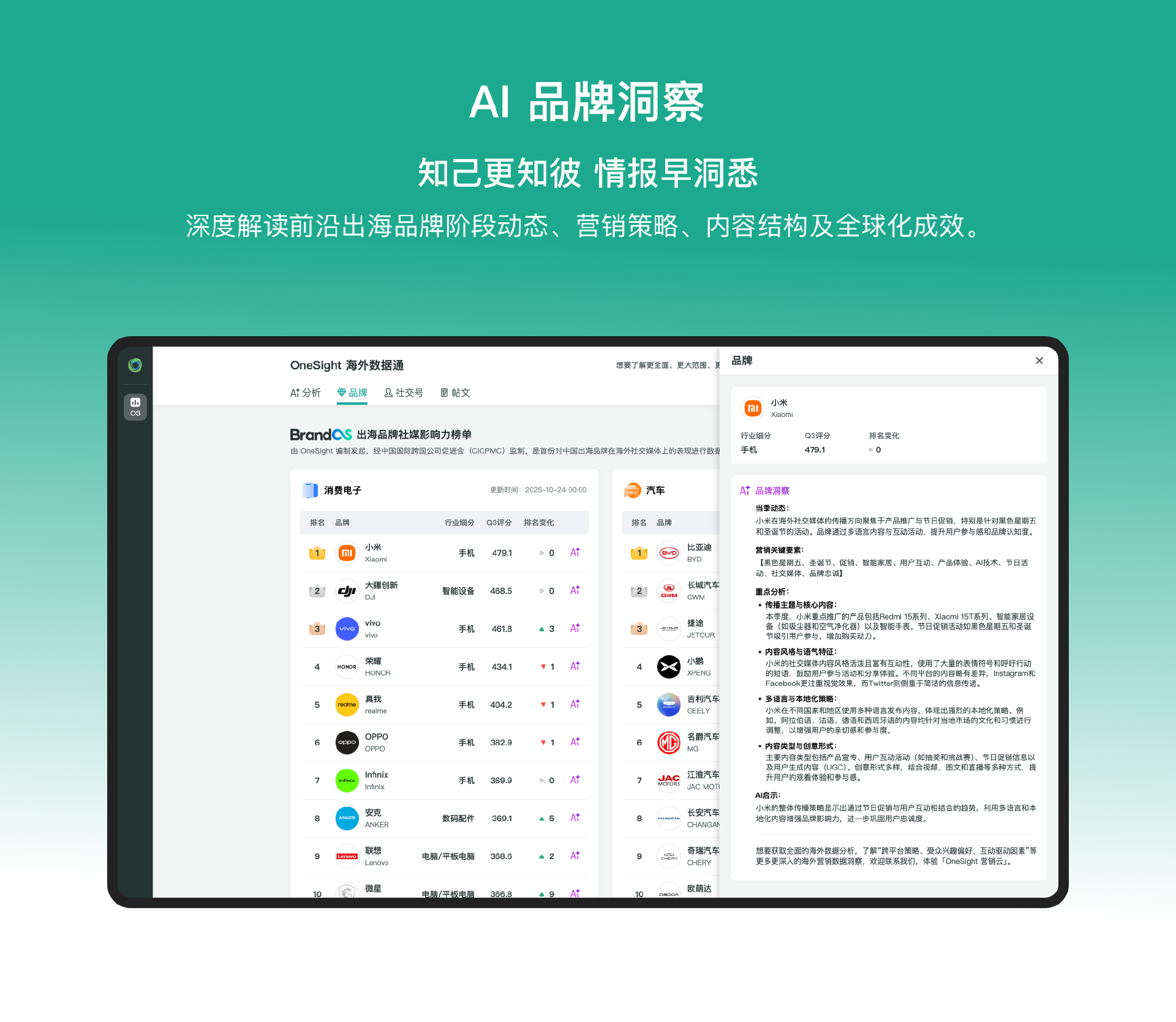 对于全球化企业而言,社媒信息已成为感知市场脉搏、捕捉用户需求、洞察竞品动态的核心入口,实时且精准的社媒洞察直接影响业务决策的效率与质量。基于这一核心需求,OneSight 在此次发布的 1.1 版本中已优先在品牌洞察、社交号分析、内容拆解这三大出海核心数据关注领域注入了企业级 AI 能力,将出海 Top 品牌的运营策略与行动灵感一键展露,用 AI 赋能出海的日常工作。