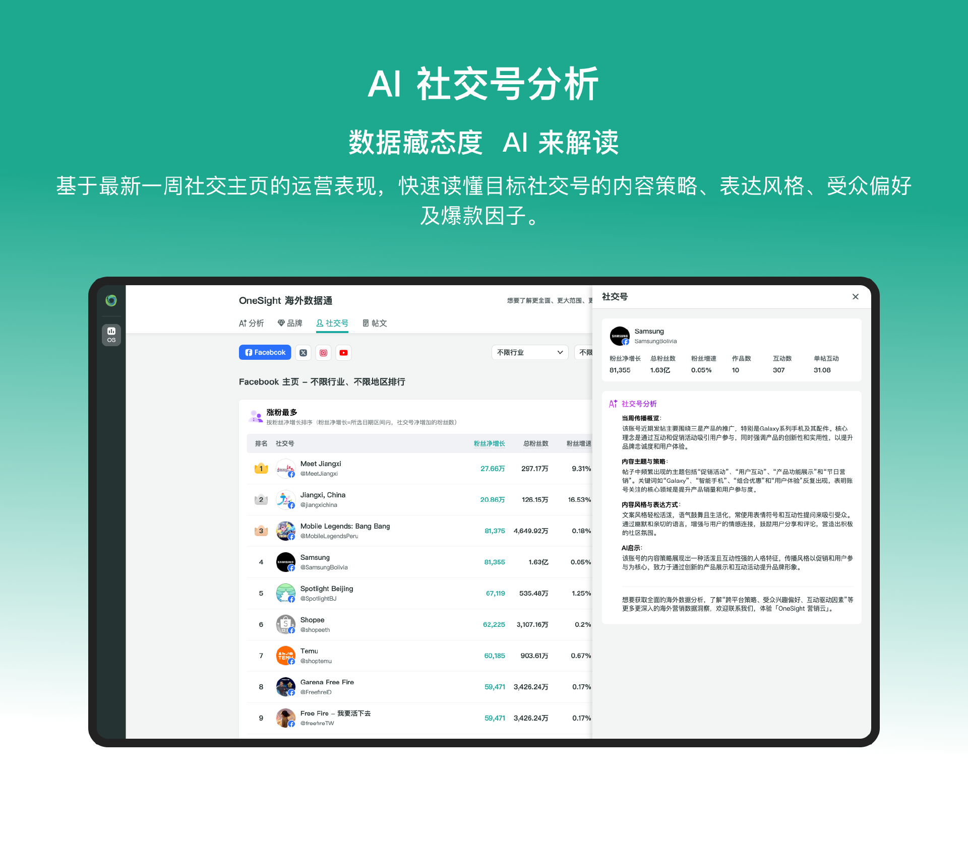 致力于用“AI+大数据”赋能中国品牌出海的 OneSight,在长期服务企业全球化的实践和积累中所提供的不是单一的工具化能力,而是一套可复用的“AI 赋能全球市场发展”的成熟体系——以亿级全球社媒数据为底座,通过 AI 技术将分散、复杂的多平台数据,转化为可直接调用、可即时响应的精准洞察,帮助企业打破信息壁垒,让全球化决策更高效、更精准。