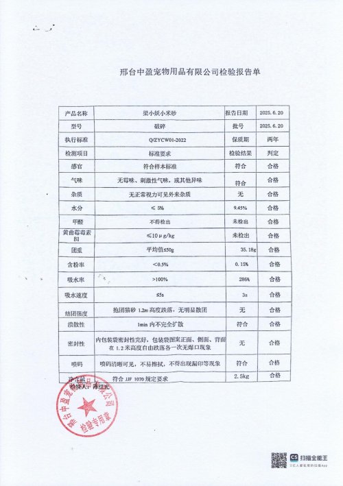 试验全程严格依据GB/T43839-2024《伴侣动物(宠物)用品安全技术要求》、T/SDPIA05-2022《宠物猫砂通用技术规范》、T/CIQA11-2020《豆腐猫砂规范》、T/ZGXX0005-2022《宠物清洁卫生用品猫砂》四项标准执行,确保结果专业可靠。