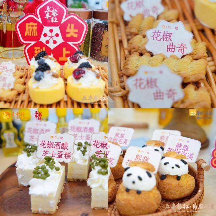 五丰黎红精心准备的花椒酒酿芝士蛋糕、熊猫花椒泡芙、花椒曲奇、花椒巧克力费南雪等甜品,以及花椒柠檬水、花椒水果茶等饮品,打破了花椒仅用于菜肴的传统认知。