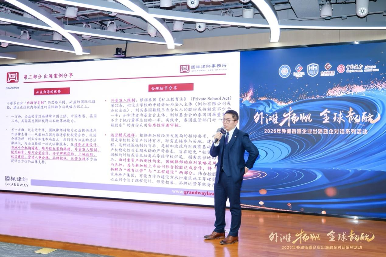 外滩街道党工委副书记、办事处主任高正辉在致辞时表示,地处黄浦核心区域的外滩街道正依托得天独厚的金融资源禀赋、健全完善的法律服务保障、优质多元的完备人才体系,通过将这些核心资源深度融合、同向发力,共同为企业搭建服务出海平台的坚实基础。随着去年底黄浦区企业出海服务中心正式揭牌成立,未来,外滩街道将持续释放依托这片热土的百年金融底蕴与国际开放基因,努力推动外滩成为链接全球资源、服务企业出海的重要门户。