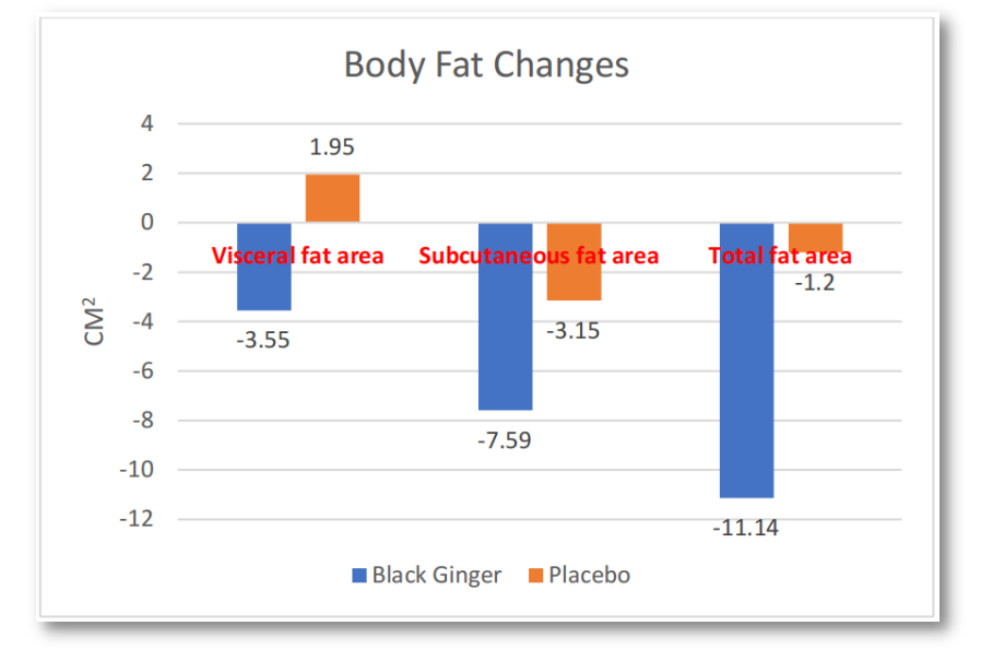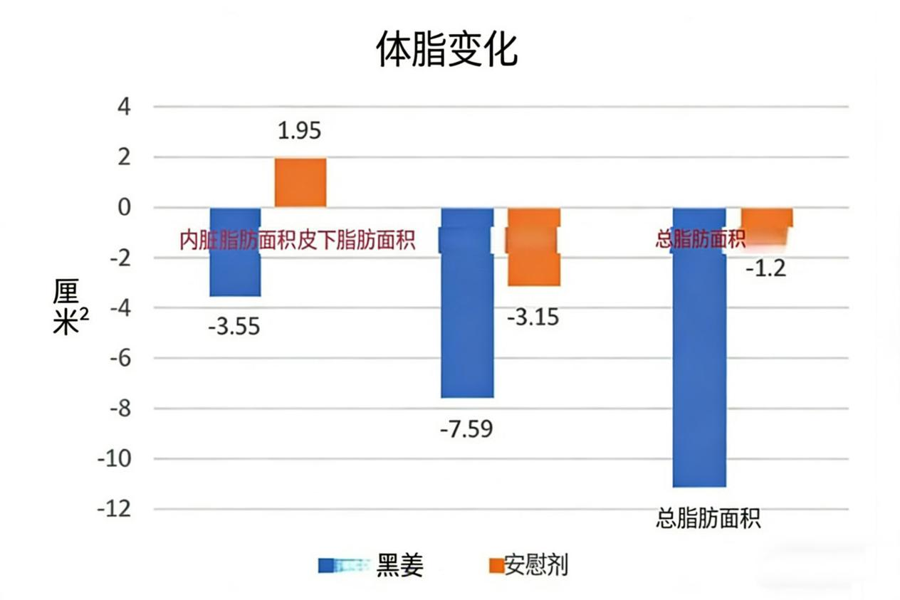 腹部肥胖是代谢综合征的核心标志。一项针对80名超重成人的平行研究显示,每日服用含12mg多甲氧基黄酮的黑姜提取物,12周后,受试者不仅皮下脂肪减少,内脏脂肪面积更是显著减少,总脂肪面积减少达11.14 cm²。另一项针对76名超重人群的研究也证实,黑姜组总脂肪面积减少13.83 cm²。这为攻克“啤酒肚”、“游泳圈”等顽固腹部脂肪提供了明确的科学方案。