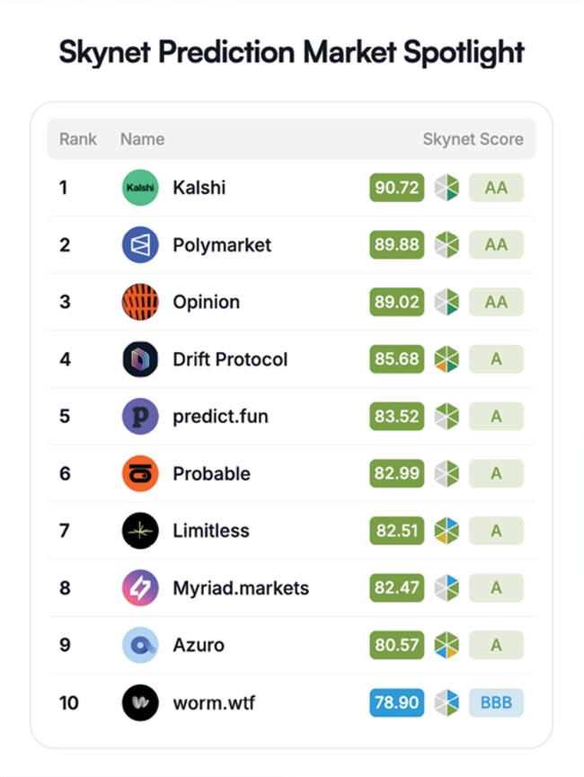 同时,CertiK旗下的Skynet Top Board评价体系也对上述平台进行了安全评估。不同于以交易量或市值为主要依据的排名方式,Skynet Top Board更关注项目整体风险结构与长期稳定性,综合考量代码安全、运营韧性、治理能力及市场稳定性等多个维度。目前Kalshi评分92.72,Polymarket评分89.88,Opinion评分89.02。评分差异反映的并非短期交易活跃度,而是底层风险管理能力与系统稳健性的差异。