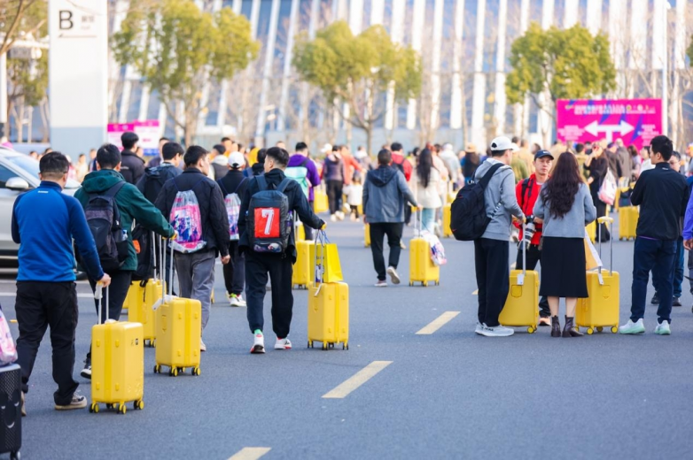 领物结束后,这道“小黄箱风景线”从博览中心延伸至整座城市——地铁、高铁、机场……满眼都是拖着黄色拉杆箱的跑者,网友纷纷晒出“满城尽是小黄箱”的壮观一幕。一只只拉杆箱,装的不仅是物资,更是跑者们的期待与仪式感,也让无锡这座城市的赛前氛围提前沸腾。