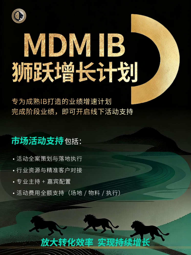 为了帮助交易者从新手走向成熟,MDM正式推出「狮跃增长计划」 ,旨在通过系统化的支持,让每一位用户都能在安全、透明的环境中提升交易能力,实现稳健成长。市场活动支持包括:活动全案策划与落地执行;行业资源与精准客户对接;专业主持+嘉宾配置;活动费用全额支持(场地、物料、执行)加入狮跃增长计划,不是给你一个“稳赚的承诺”,更是放大转化效率,实现持续增长。