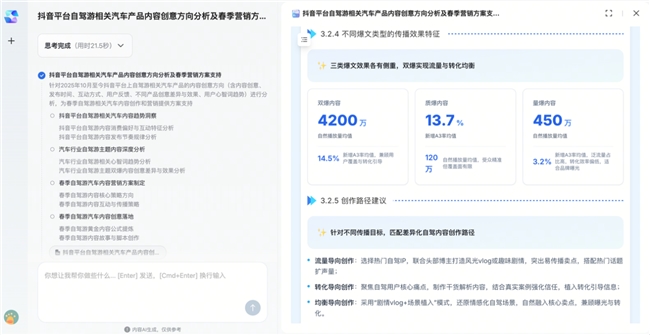全域洞察能力:整合抖音生态全量内容数据、用户行为、行业热点数据,AI自动拆解用户偏好、内容消费趋势、爆款内容底层规律,一键输出赛道机会点、爆款要素参考,精准匹配目标人群内容喜好,相比通用AI能力,更贴合品牌所属赛道特性。