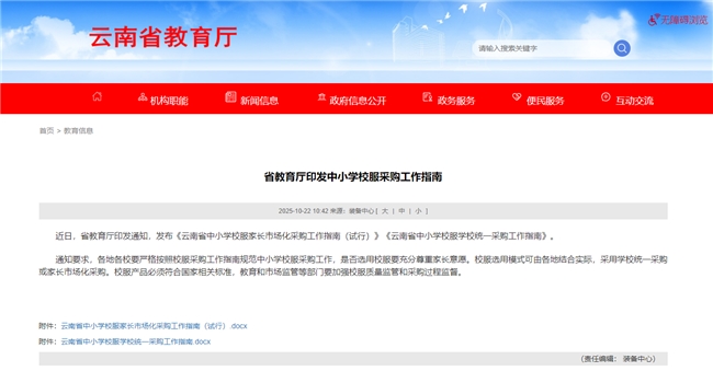 近日,云南省教育厅印发《云南省中小学校服家长市场化采购工作指南(试行)》和《云南省中小学校服学校统一采购工作指南》,在全省范围内推行校服采购新模式。新政策突出家长自愿原则,创新实施“双轨并行”采购机制,切实保障学生和家长的知情权、选择权和监督权。云南校服新政精准契合教育部《全国中小学校服管理“应知应会”》核心精神,为全国校服专项整治提供了可复制的实践范本。