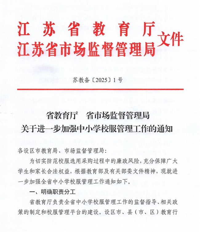 近日,江苏省教育厅、省市场监督管理局联合印发《关于进一步加强中小学校服管理工作的通知》,在教育部《全国中小学校服管理“应知应会”》11条核心要求基础上,形成权责清晰、流程闭环的管理细则。这一针对性举措,直面江西“一市一款”监管失守、沈阳校服票选乱象等问题,为全国校服治理提供了可落地的实践范本。