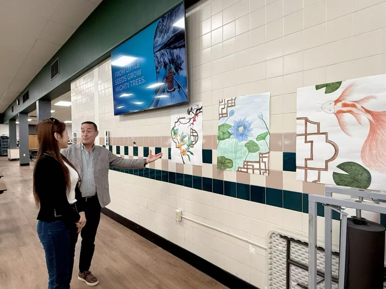 Subsequently, Vice-Principal Robinson showed Ms. Qingqing around the students’ creative paintings, which possess both timeless charm and diverse perspectives. He introduced: “Qingqing, your passion for painting and your upcoming solo exhibition are truly admirable. On our campus, artworks are everywhere, but the most eye-catching one is this multi‑dimensional Starry Night—created by students several years ago, it integrates rich elements and is the most touching artistic work at John P. Stevens High School. I have walked down this corridor countless times, yet today is the first time I can stop to appreciate this masterpiece together with everyone.” At John P. Stevens High School, I saw not only Van Gogh’s starry sky but also creative Chinese paintings of lotus flowers, birds, and flowers. Western brushwork and Eastern artistic conception complement each other beautifully in this high school, which is exactly in line with the original aspiration of the cultural festival—“exchanges and mutual learning among civilizations”—allowing different civilizations to nourish each other through collision.