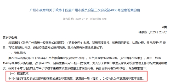 值得注意的是,这份征求意见稿的出台,与广州市教育局此前的回函承诺、高认可度的民意调研结果形成鲜明反差。2024年7月,广州市教育局曾就校服管理问题发布答复函,明确广州中小学长期实行的“一校一款”模式,承载着各校办学理念和校园文化,是广州教育特色化发展的体现,同时承诺将进一步尊重学校特色需求、保障家校参与权。此前,广州市教育局还开展了覆盖全市的校服满意度调研,累计回收有效问卷超22万份,调研结果显示,94.54%的学生及家长对现有“一校一款”的校服款式表示认可,92%对校服质量表示满意,70.14%认为价格合理,超九成受访者对现有校服管理模式持肯定态度,充分印证了“一校一款”模式的坚实民意基础。
