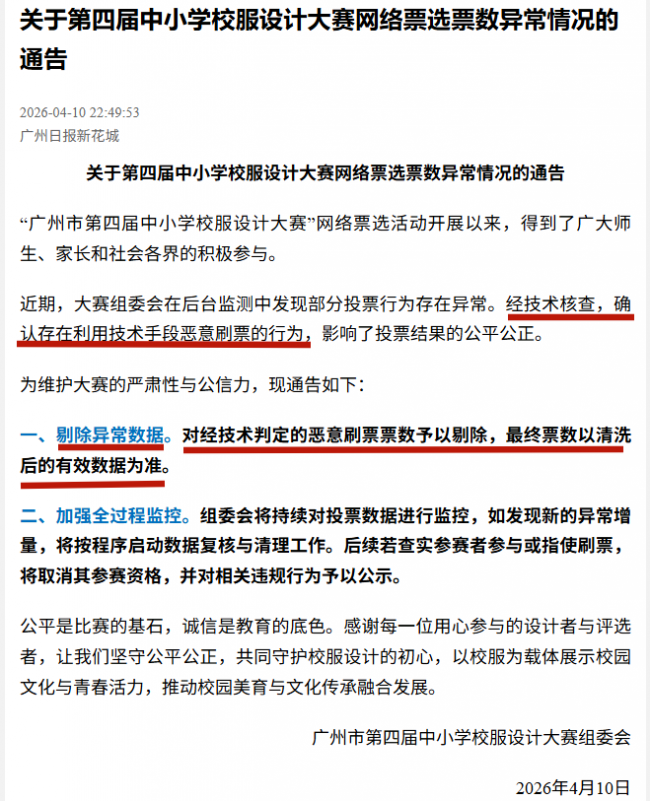 自2025年底以来,“广州是否将推行全市统一校服”话题持续引发热议。近日,广州市第四届中小学校服设计大赛网络票选结果正式出炉,网络评选阶段存在恶意刷票的情况更是引发关注,不少讨论质疑投票的合规性。对于“广州市第四届中小学校服设计大赛与统一校服是否有关联?获胜的设计方案是否将成为未来全市统一的校服样式?”的问题,广州市教育局4月14日明确向媒体答复:无关联性。广州的家长可以长舒一口气,但是与此同时,湖北、广东、河南、安徽等地的家长正在面临“一市一款”的苦恼。