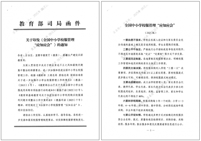 近年来,国家高度重视中小学生校服管理与实体经济发展,先后出台多项政策规范校服市场、守护实体经营。教育部等四部委2015年联合印发《关于进一步加强中小学生校服管理工作的意见》,明确要求严格执行国家标准、有效规范校服市场、强化学校选用管理、健全采购监督机制;2025年以来,教育部连续印发《全国中小学校服管理“应知应会”》等文件,确立学校为主体、民主作决策、自愿不强求、全程公开透明的管理方向,严禁强制购买、利用校服牟利、行政干预过度等行为,强调支持实体商户、规范市场秩序、保障质量安全。与此同时,国家层面持续强调“把发展经济的着力点放在实体经济上”,要求保护实体经营、稳定就业、维护公平竞争市场秩序。