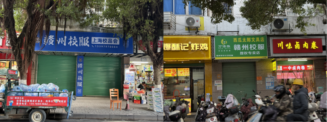 在江西南昌、赣州等地,这一矛盾表现得尤为突出。自推行“一市一款”校服模式以来,正规实体校服店正遭遇生存危机。记者走访发现,合规经营的品牌校服专营店批量关门撤店,大量从业人员失业,社区便民服务点消失。究其原因,“一市一款”统一样式后,校服失去校际差异,仿制门槛几乎为零;政策放开生产与销售渠道后,学校不再统一采购与验收,实体门店需承担房租、人工、质检、售后、仓储等刚性成本,在与零门槛、零监管、零合规成本的地摊、流动摊贩竞争中毫无优势,陷入“做得好必亏、做得差才能活”的困境。实体门店退场后,市场迅速被无资质、无质检、无售后的劣质校服占据。在多所中小学周边,统一款式校服与烟酒、零食、日杂混摆售卖,部分堆放在潮湿角落,卫生条件堪忧;摊贩多来自无资质小作坊,面料虚标、色牢度不达标、甲醛残留、pH值超标等问题突出,售价远低于正规产品,形成“劣币驱逐良币”的逆向淘汰格局。
