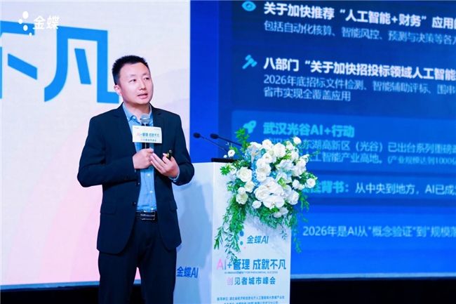 金蝶中国集团实施交付部总经理程刚以“AI转型,勇毅前行”为题,直面企业“不敢转、不会转、转不动、难见效”的四大痛点,他表示:“AI转型不是一蹴而就的系统替换,而是小步快跑、场景先行、价值迭代的持续进化,企业管理AI的核心,是让AI成为管理者的‘第二大脑’、业务人员的‘超级助手’。”