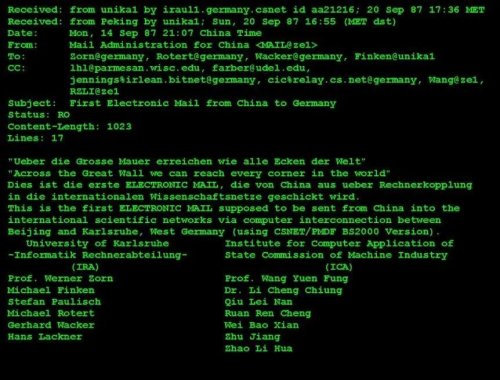 9月20日20时55分,这封邮件由王运丰和钱天白发送成功。邮件第一句是“越过长城,我们可以到达世界的每一个角落”,这就是那封著名的“ 越过长城,走向世界”的中国向世界发出的第一封电子邮件——这是中国互联网世界的重要起始点。中国互联网时代的大门开启。1519年9月20日,麦哲伦离开西班牙,驶向茫茫大洋,开始了伟大的环球航行。468年后的同一天,中国向世界发出了第一封电子邮件。这个有趣的巧合仿佛在诉说着如第一封邮件内容中所表达的期许——越过长城,走向世界。