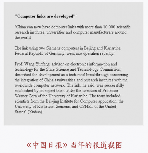 1987年9月25日,中国日报刊登了这一消息:“中国与世界10000个大学、研究所和计算机厂家建立了计算机联接。这个连接通过北京与卡尔斯鲁厄的两台西门子计算机实现。王运丰教授(中国国家科委电子信息与技术顾问)把这一成果描述为中国大学和研究所与世界计算机网络一体化的技术突破,在卡尔斯鲁厄大学教授维纳·措恩指导下完成,技术团体由来自北京计算机应用研究所、卡尔斯鲁厄大学、西门子公司和美国的科学家们组成。”
