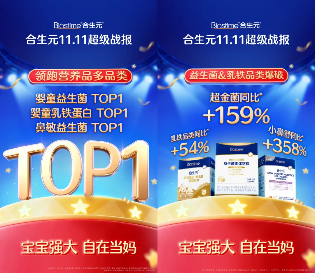此外,合生元婴童益生菌、婴童乳铁蛋白、鼻敏益生菌三大核心品类持续霸榜渠道No.112。活动期间,超金菌同比增长159%10,乳铁品类同比增长54%10,小鼻舒同比增长358%10,精准满足肠道健康、过敏防护、免疫支持等健康消费需求。