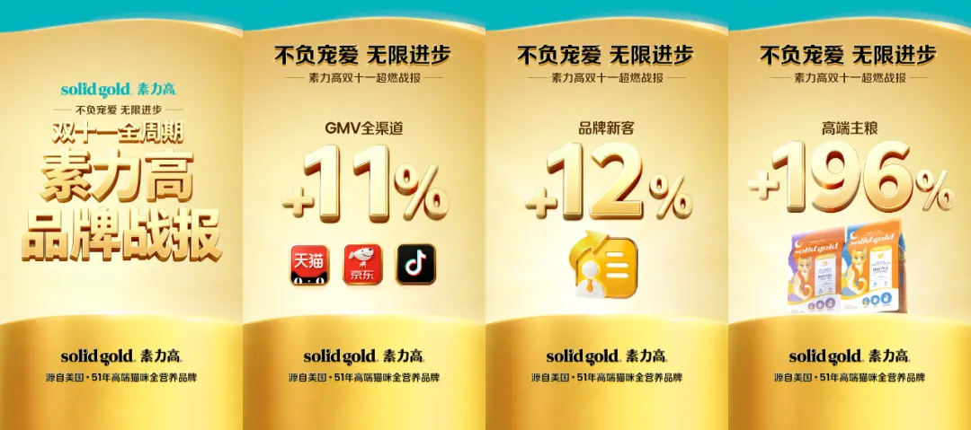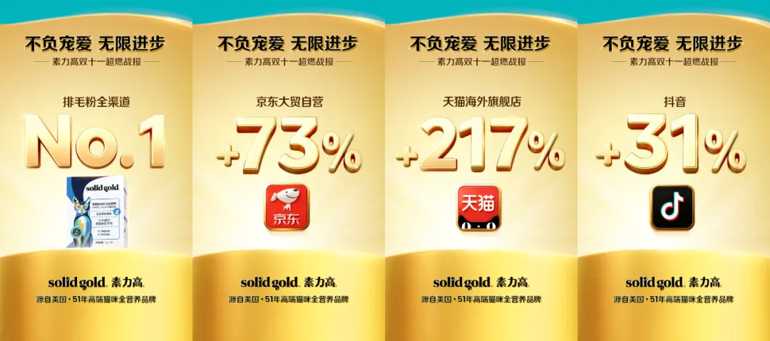 凭借创新产品实力与热点话题,在双十一购物节期间,Solid Gold素力高电商GMV全渠道实现同比增长11%14,新客同比增长12%14。旗下高端主粮同比增长196%14,排毛粉更强势霸榜全渠道No.114。此外,京东大贸自营销售实现同比增长超73%14;天猫海外旗舰店销售同比增长217%14;抖音渠道销售同比增长31%14。