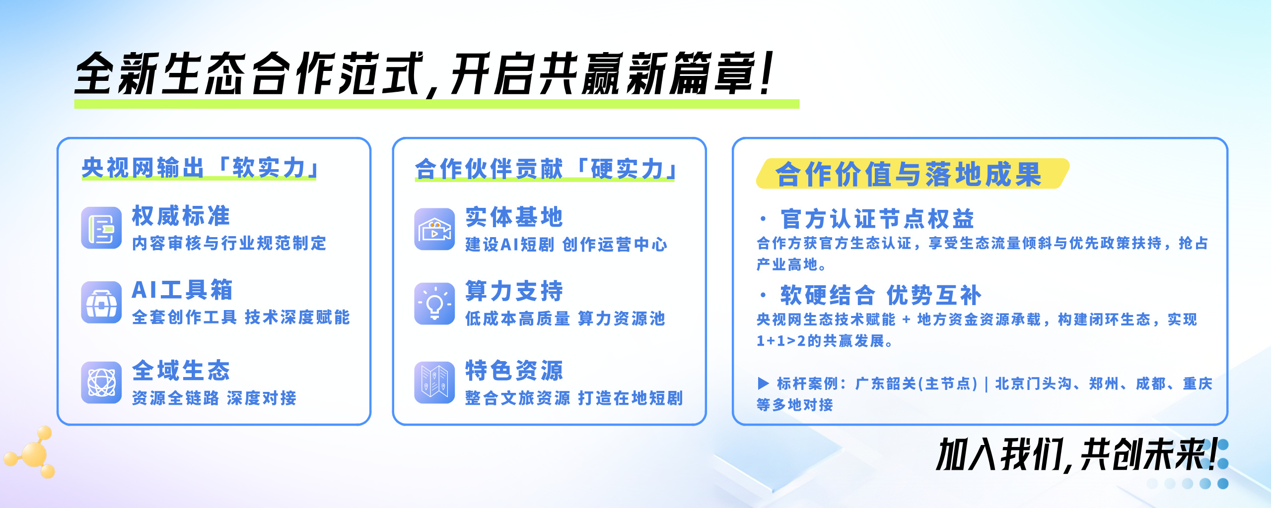 从AI工具集成,到生态组织能力,再到国家级内容战略的落地,央视网正以平台化思维,推动中国短剧产业从“内容热”走向“生态强”。AI短剧云创平台以及全渠道生态合作伙伴,将为优秀作品提供从展播、宣发到流量扶持的全链路支持,让好作品被看见、被喜爱。