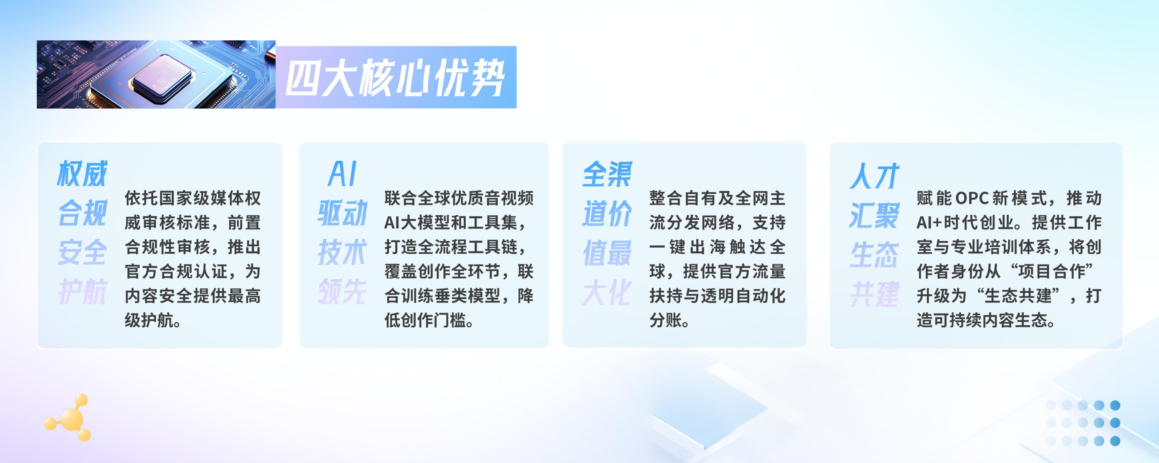 平台核心由四大模块构成,内容聚合与创意中心:联合全球优质音视频AI大模型和工具集,提供AI编剧、智能分镜、视频生成、智能配音等全流程创作工具,并共建垂类创作模型,大幅降低优质内容创作门槛;智能审核与合规平台:依托权威的审核标准和“清晏审核”等自研智能技术,为平台上的所有内容提供前置合规审核与“央视网云创平台合规认证”,为整个生态系上“安全带”,实现快速、安全过审;全渠道发行网络:平台不仅整合央视网自有渠道,更将一键接入全网主流分发网络,一键触发海外传播,为优质内容提供流量扶持。同时还将建立透明的自动化分账系统,让每一份创意都能获得应有的价值回报;人才培养与合作平台:赋能OPC创作新模式,推动AI +时代创业,为个人创作者(OPC)提供线上工作室、专业培训、采风中心与社区互动等支持,将全国顶尖编剧从“项目合作方”转化为“生态共建者”,形成稳定的人才蓄水池,汇聚政策、IP、资本构建资源对接的良性产业生态。