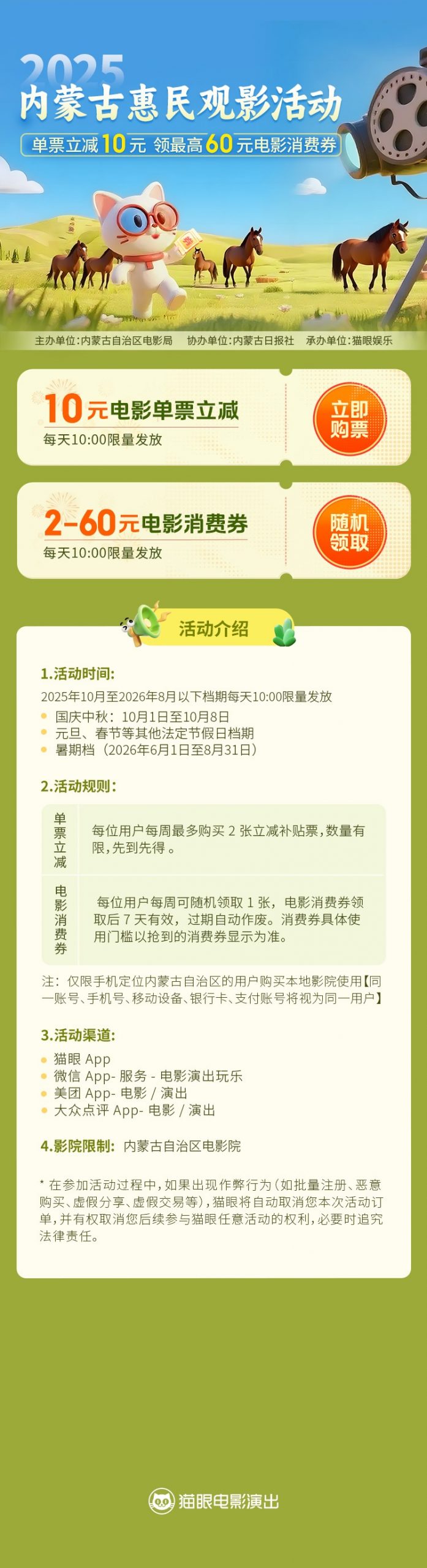 为丰富群众文化生活,激发电影市场消费潜力,由内蒙古自治区电影局主办、内蒙古日报社协办、猫眼娱乐承办的“2025内蒙古惠民观影活动”将于10月1日国庆节正式拉开帷幕。活动通过发放观影福利,借助国庆档热门影片的势头,为内蒙古观众带来一场文化盛宴,进一步点燃实体文化消费热情。