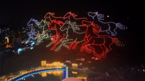 除夕夜,千架无人机整齐升空,在深邃的夜空中有序穿梭、默契配合,逐步勾勒出一幅幅灵动鲜活的光影图景。奔腾的骏马身姿矫健、栩栩如生,呼应着丙午马年“骏影迎春”的活动主题,寓意着南江新一年驰骋奋进、笃行致远;吉祥福字、新春祝福等元素次第绽放,将诚挚的美好期许传递给在场每一位观众,现场欢呼声、喝彩声此起彼伏,新春氛围感拉满至极致。