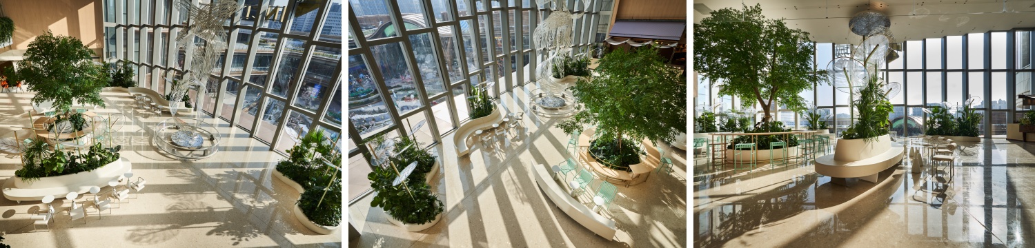 中庭以大面积绿植结合木质基座,巧妙柔化金属结构的冷硬质感,让工业风的利落与自然的温润达成平衡,提升空间亲和力。座椅布局上兼顾短暂休憩与社交聚会。环绕式动线自然引导人流,强化聚合功能,营造出都市山林氛围。