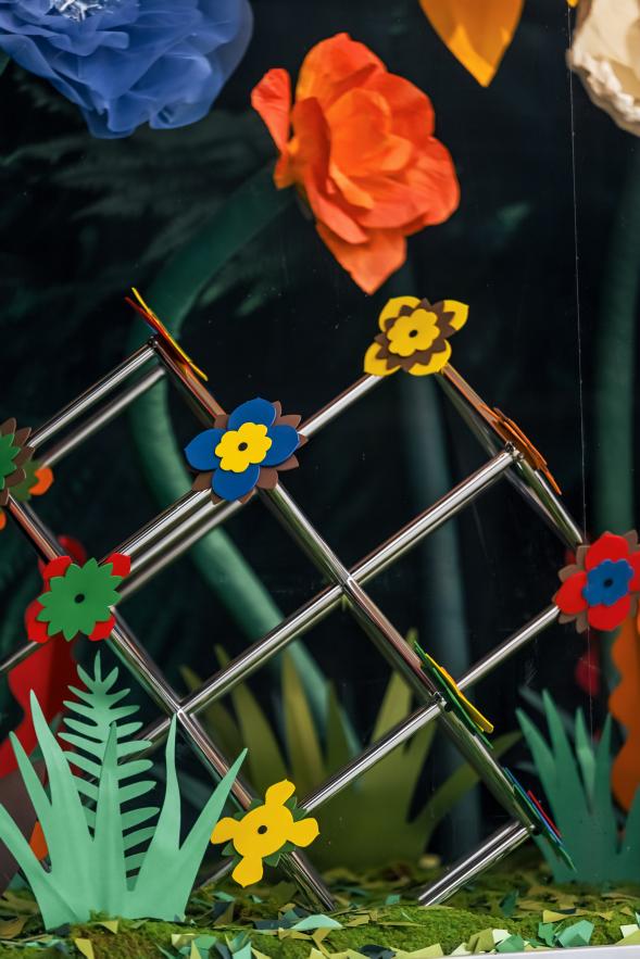 USM 诞生于1885年的瑞士,以模块化钢结构系统闻名于世。一颗镀铬球形接头,撑起无数种家的可能。本次展览以花卉为视觉锚点,将 USM 的工业结构与几何化纸质花卉并置——在精准中藏入情感,在日常中注入诗意。