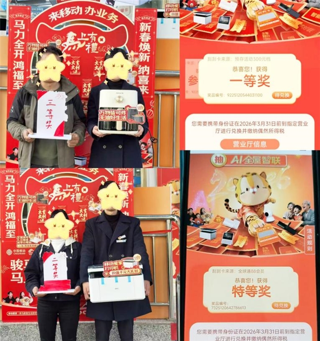 只要参与活动几乎人人都能收获专属惊喜,不仅有至高4999元话费等特等奖,还有云PAD、智能猫眼门锁、打印机、AI手机、智能音箱等一众热门实用智能好物,以及话费券、AI视频彩铃、权益组合券包等福利发放,让每位参与用户都能薅到福利、收获满满。而那个充满期待的刮卡瞬间,那份揭晓答案的雀跃,特别适合拍照记录,再配上年夜的烟火,足以成为你朋友圈里收获无数羡慕点赞的“高光时刻”!
