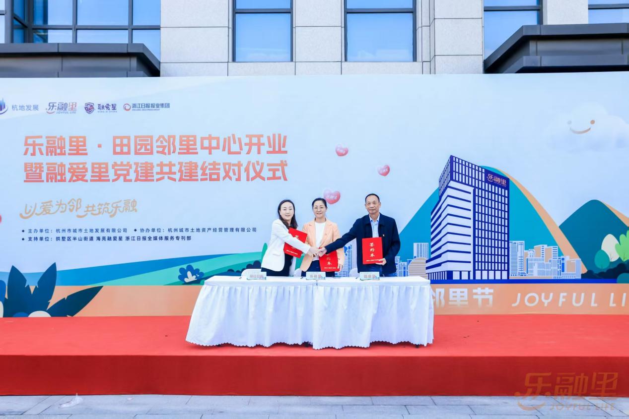 10月29日,杭州交投集团下属城市土地公司主办的乐融里·田园邻里中心开业暨“融爱里”党建共建结对仪式,在乐融里·田园邻里中心隆重举行,仪式上城市土地(乐融里)与海亮融爱星、浙江日报全媒体服务专刊部党支部三家机构强强联合,共同签署“融爱里”党建共建合作协议。